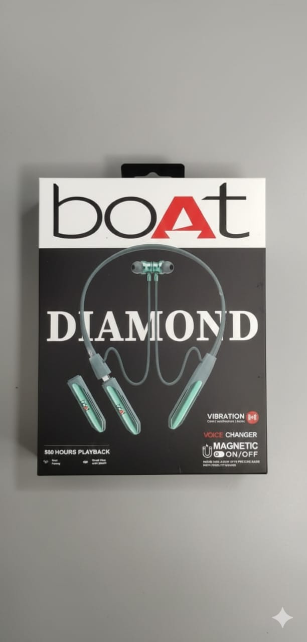 boAt Diamond Neckband powerful battery, clear bass aur smart features ke saath aata hai. 10 min charge me 24 hrs playback, vibration alert aur magnetic earbuds ke saath daily use ke liye perfect choice.