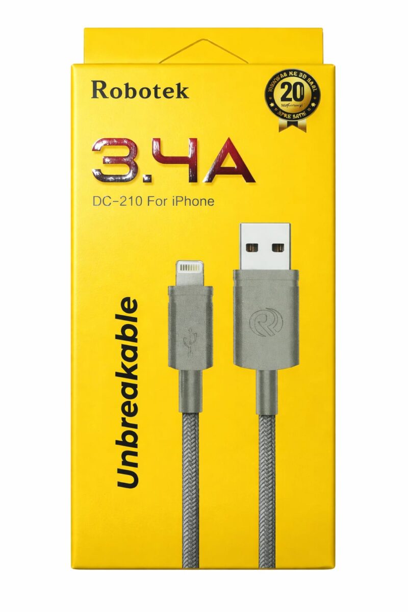 Robotek DC-210 3.4A lightning cable for iPhone with fast charging & unbreakable braided design.